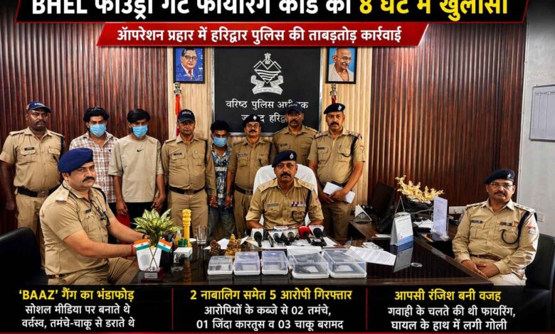 रानीपुर | हरिद्वार । 21 अप्रैल 2026 की रात BHEL फाउंड्री गेट के पास हुई फायरिंग की घटना का रानीपुर पुलिस ने महज 08 घंटे के भीतर खुलासा करते हुए 02 नाबालिग सहित 05 आरोपियों को गिरफ्तार कर लिया। आरोपियों के कब्जे से 02 तमंचे (315 बोर), 01 जिंदा कारतूस व 03 अवैध चाकू बरामद किए गए हैं।