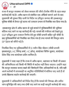 हरिद्वार पुलिस कप्तान नवनीत सिंह भुल्लर ने इकबालपुर क्षेत्र में चल रहे अवैध खनन के खिलाफ बड़ी कार्रवाई की है। पुलिस कप्तान ने इस मामले में झबरेडा थाने के इकबालपुर पुलिस चौकी इंचार्ज समेत अन्य 6 कर्मियों को तत्काल प्रभाव से निलंबित कर दिया है। वही पूरे मामले की जांच एसपी देहात शेखर चंद्र सुयाल को सौंपी गई हैं।